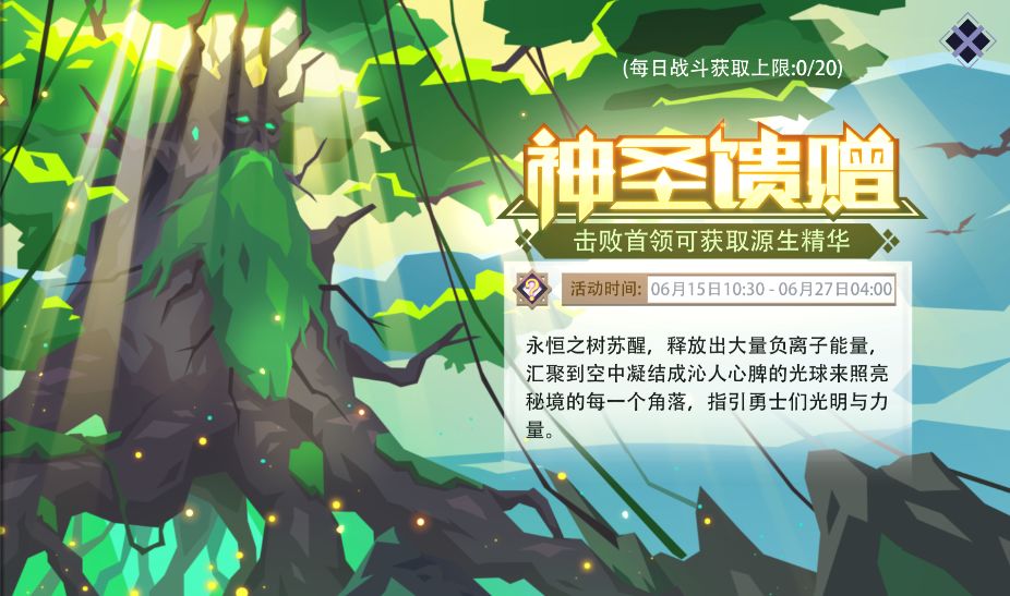 活动内容:活动期间,在[冒险模式]或[梦魇模式]下击败每一层的首领,均可获得随机数量的‘源生精华’;每日上限为20个。所得的‘源生精华’将直接放入玩家的背包内,可用来合成‘星辰之耀’;星辰之耀打开后能获得随机奖励。