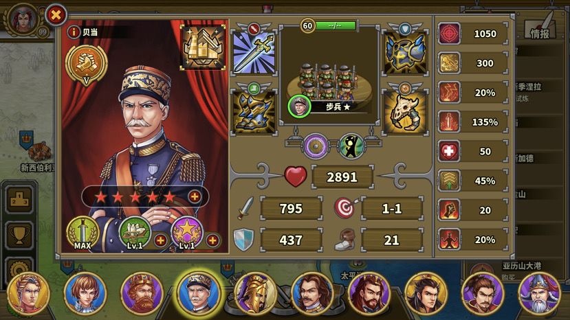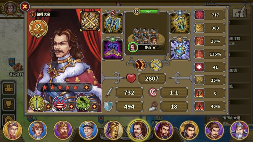 彼得大帝虽然脆,但是有破坏+谣言(1级忽略,后期建议点满)神技可以先手,到站位注意靠后,不然下回合挨两下就残了,指挥官残了会很难受。