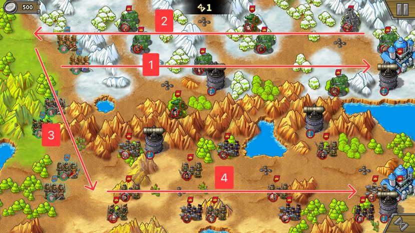 (1)下图中红圈框出来的是不能走的山脉,小心在这几个地方被堵路耽误回合。上路开局不要贴着骑兵站,仅派个人站在绿圈位置把骑兵引过来,上路“门”就开了。下路同理,现在离两个步兵一两格的距离引他们过来,不要一上去就贴脸,会把自己堵死。