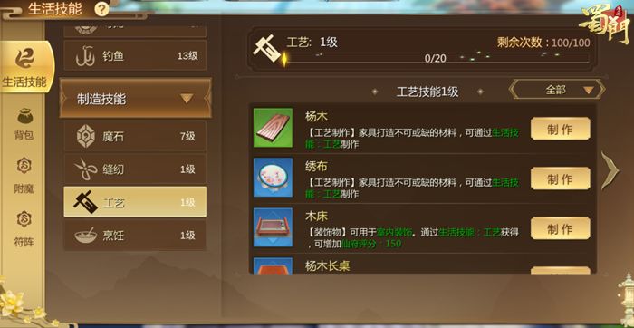 工艺主要是用于制作仙府相关的家具和材料,原材料大部分是在仙府内种植产出,少部分可以通过寻龙获得。