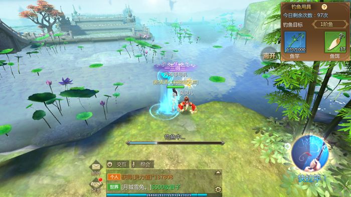 靠近这个蓝色的钓鱼点之后,在左边会出现一个点击钓鱼的提示,点击就可以开始进入钓鱼模式了。点击钓鱼,进度条从右到左,当有鱼上钩后,右下角出现“快拉杆”,在读条转完之前点击按钮,就能收到钓到的材料了,同时还会自动开启下一轮钓鱼,持续的拉杆就可以了。