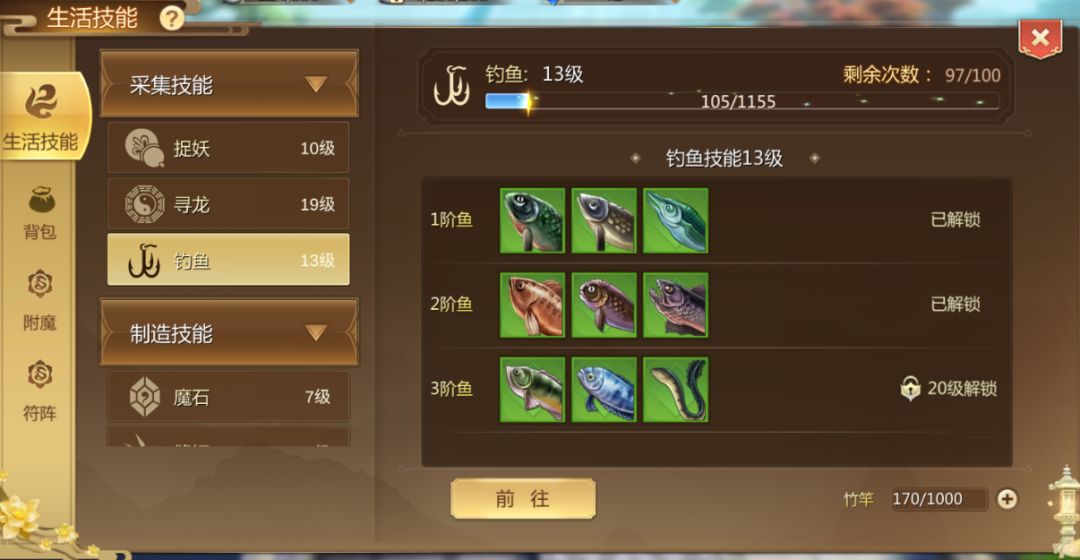 生活技能主要分为【采集】和【制作】两类,分别有:捉妖、寻龙、钓鱼;魔石、缝纫、工艺、烹饪。同时可以通过生活技能给自己增加【附魔】和【符阵】两种限时的可以提升战力的BUFF,下面我们详细来看看吧。文章有点长,大家可以直接拉到有需要的地方查看。