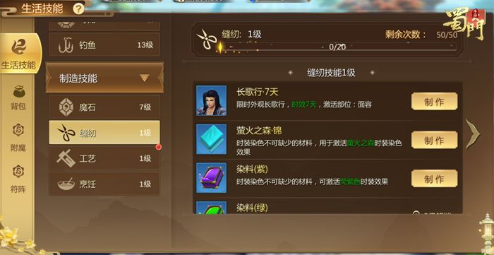 采集类生活技能寻龙可以获得缝纫所需要的材料,用以制造限时面容、染料和染色用布匹。