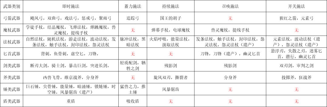 忽然发现,按游戏机制,武器技能施法大致分成即时施法,蓄力施法,持续施法,开关施法和召唤施法五个种类