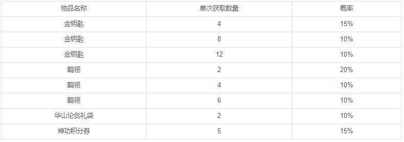 2、可抽取:金钥匙、鹊翎、华山论剑礼袋等超值大奖,100%中奖率!
