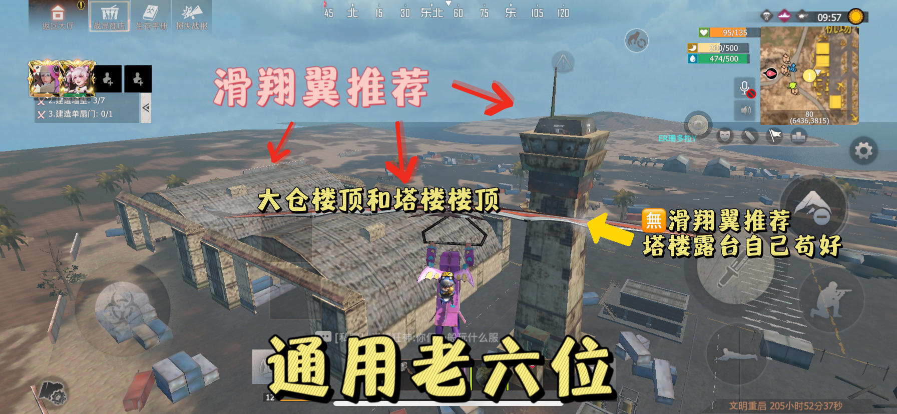 通用老六位 如图所示,初级老六可以来这几个地方来蹲,有滑翔翼的小伙伴是真的吃香了,视野好的地方都能去。没有滑翔翼的小伙伴不要灰心,除了高台可以去,接下来的也可以蹲人哦。