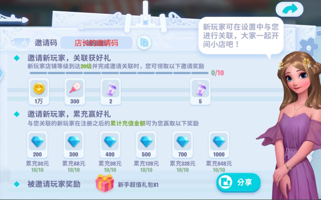 店长的好友分享邀请码当邀请1人—10人分别会达到不同的好礼里程碑阶段,获取不同等级的高价值物品,邀请奖励10人,并且要进行成功店铺经营(达到20级的新玩家)!