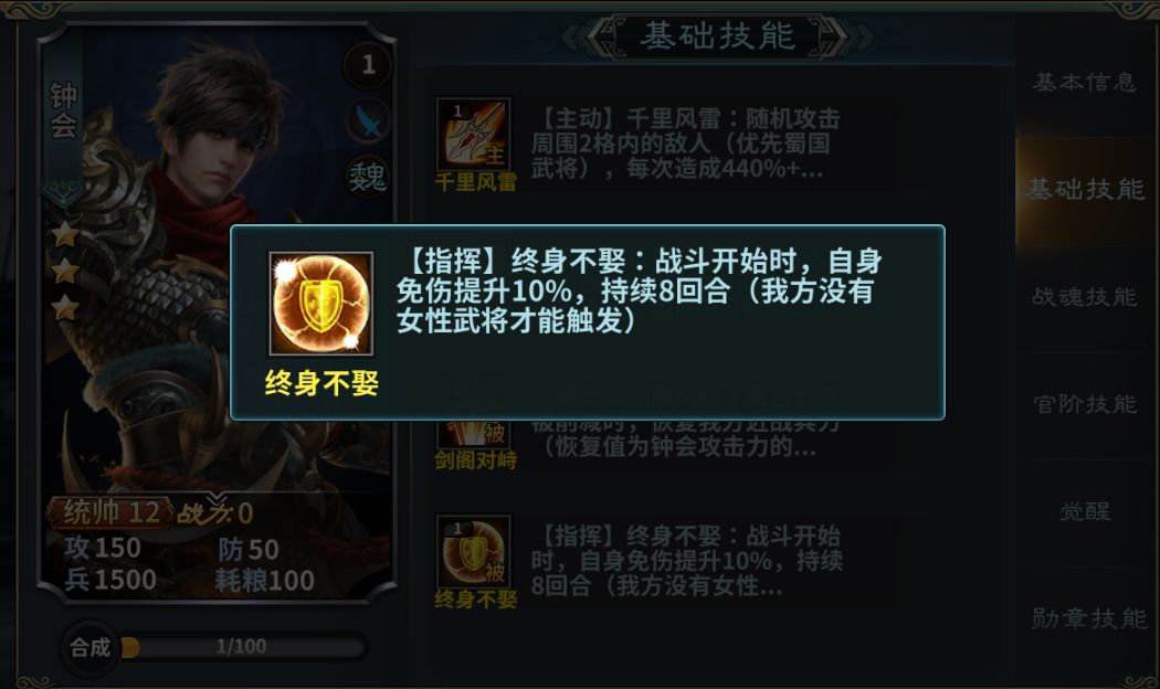 被动技能:【指挥】终生不娶:战斗开始我方没女性武将,提升自身免伤10%