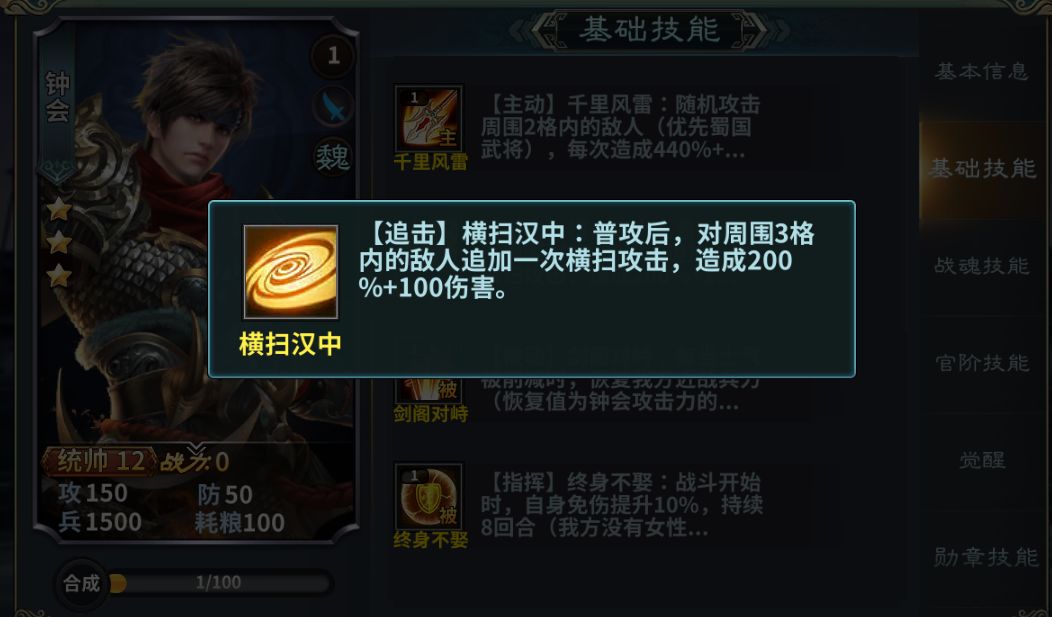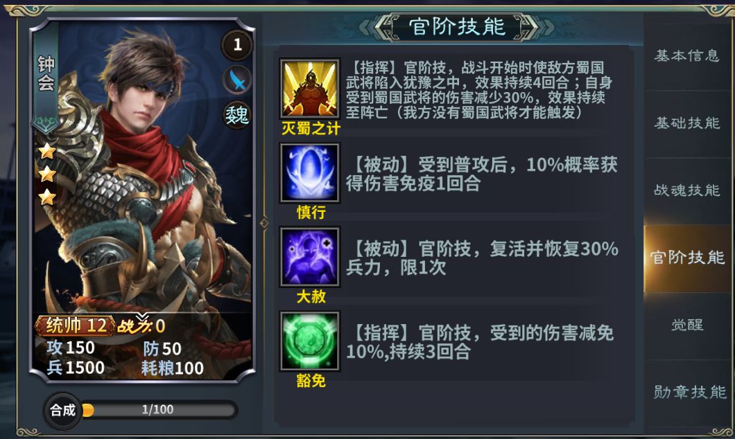 钟会:魏国步兵,技能具有提升自身免伤、降低敌方免伤、恢复兵力、追击效果。