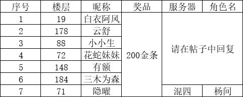 活动的获奖名单来啦,让我们一起来看一下本次有哪些侠奖了吧,大家请务必记得参与后续活动时直接留言自己的区服角色名,以便我们后续发奖统计。