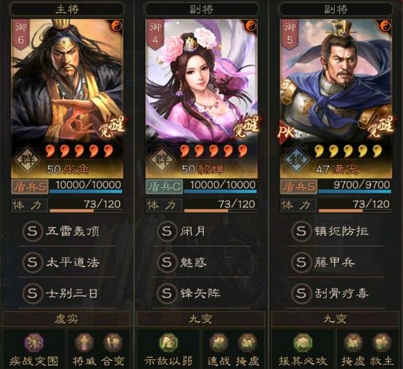 总结:这个队伍这大的亮点其实不是强度有多高,而是只有C级盾兵的貂蝉完全可以吃住伤害完成多穿,如果不看战报的话可能很多玩家第一感觉就是貂蝉C级兵种的队伍肯定是玩不了,一到战场上就是宝宝队伍,结果没想到那么能打!当然了,如果是白板貂蝉的话肯定是吃不消的,同时这个队伍的主C是张角,基本上达到3红+天公的水平就可以玩了!