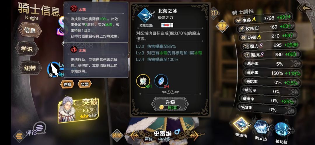 核心天赋,注定史雷维需要5星才拥有高输出及控制,冰冻转晕眩直接软控变成硬控,80%魔伤配合寒冬4级天赋必暴也能在无多娜的情况下照常大量伤害。