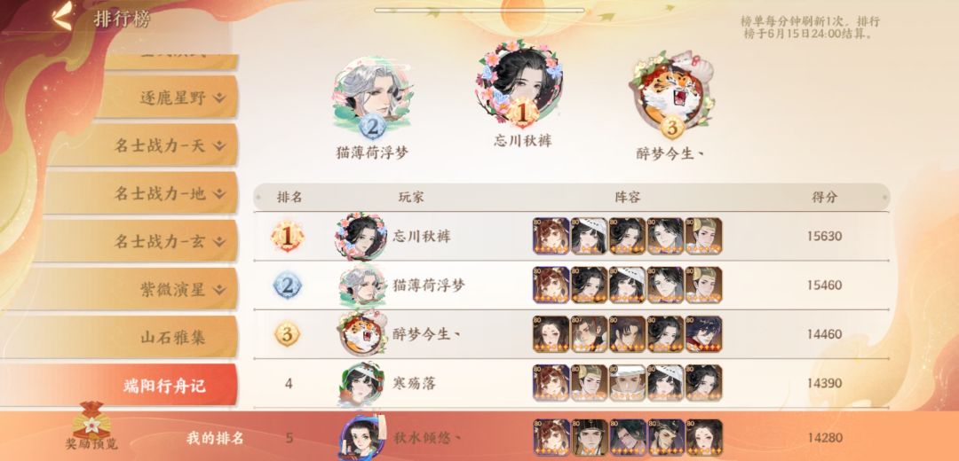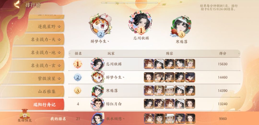 ◇我在忘川风华区,也是非常的卷,可以看到排行榜上面高练度巨佬们的阵容。