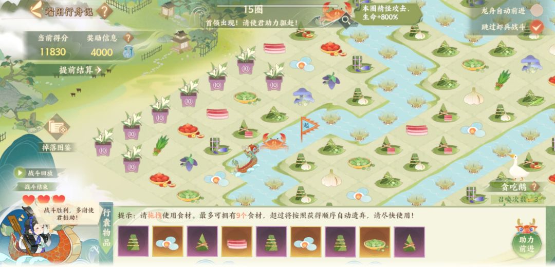 枕形粽有复活的效果,是这个玩法不翻车的必备道具。基本上河道中要铺满枕形粽的加成。而配套的有两种,一是咸蛋(复活一次80%,加12%暴击),一种是大蒜(复活三次30%),因为后期我们基本上会被平a挂掉,所以咸蛋枕形粽没有什么意义,只能选择大蒜枕形粽。枕形粽要覆盖全部河道,旁边一定要留个位置摆大蒜。