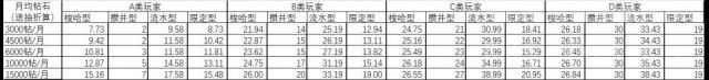 所有类型都尽可能抽满每日的50钻/2星碎,BCD都会买满超得,CD两类抽装备池,D类买98元的10抽20星碎,按只买一个518计算,E类不纳入计算