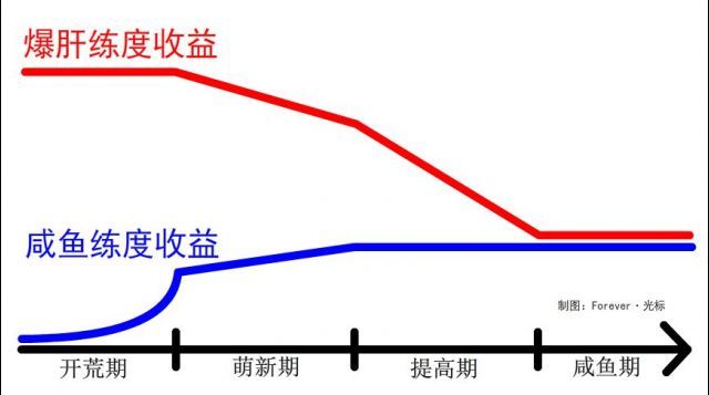 下图简单展示了在不同时期,爆肝与咸鱼,获得的练度提升程度: