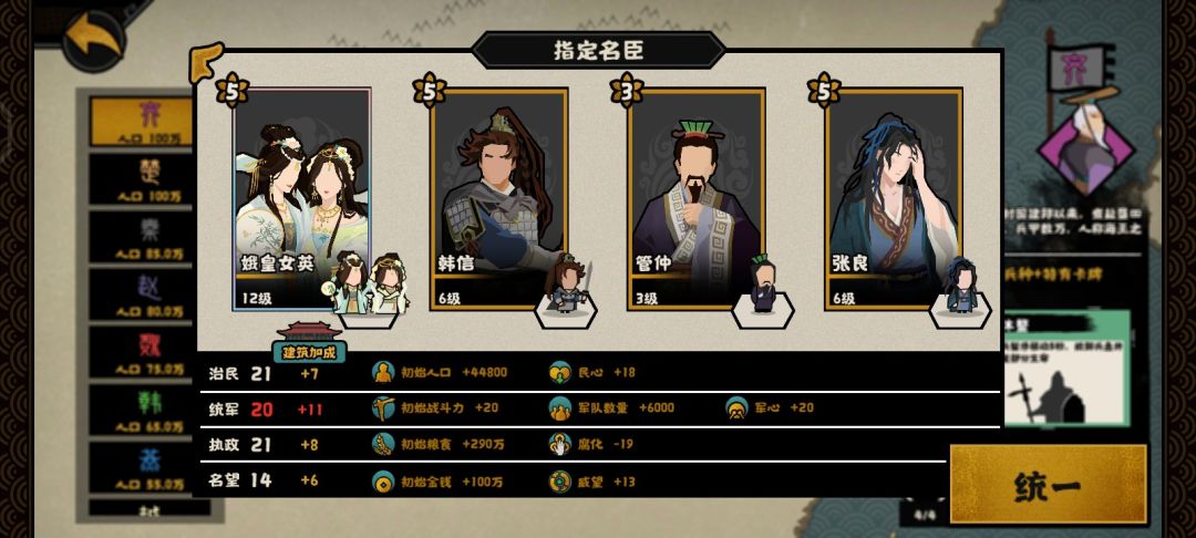 五星情况下娥皇女英+20%,韩信+20%,张良+20%开局加60%的规模,直接规模碾压,打不过可以用管仲的尊王攘夷来给军团增加buff