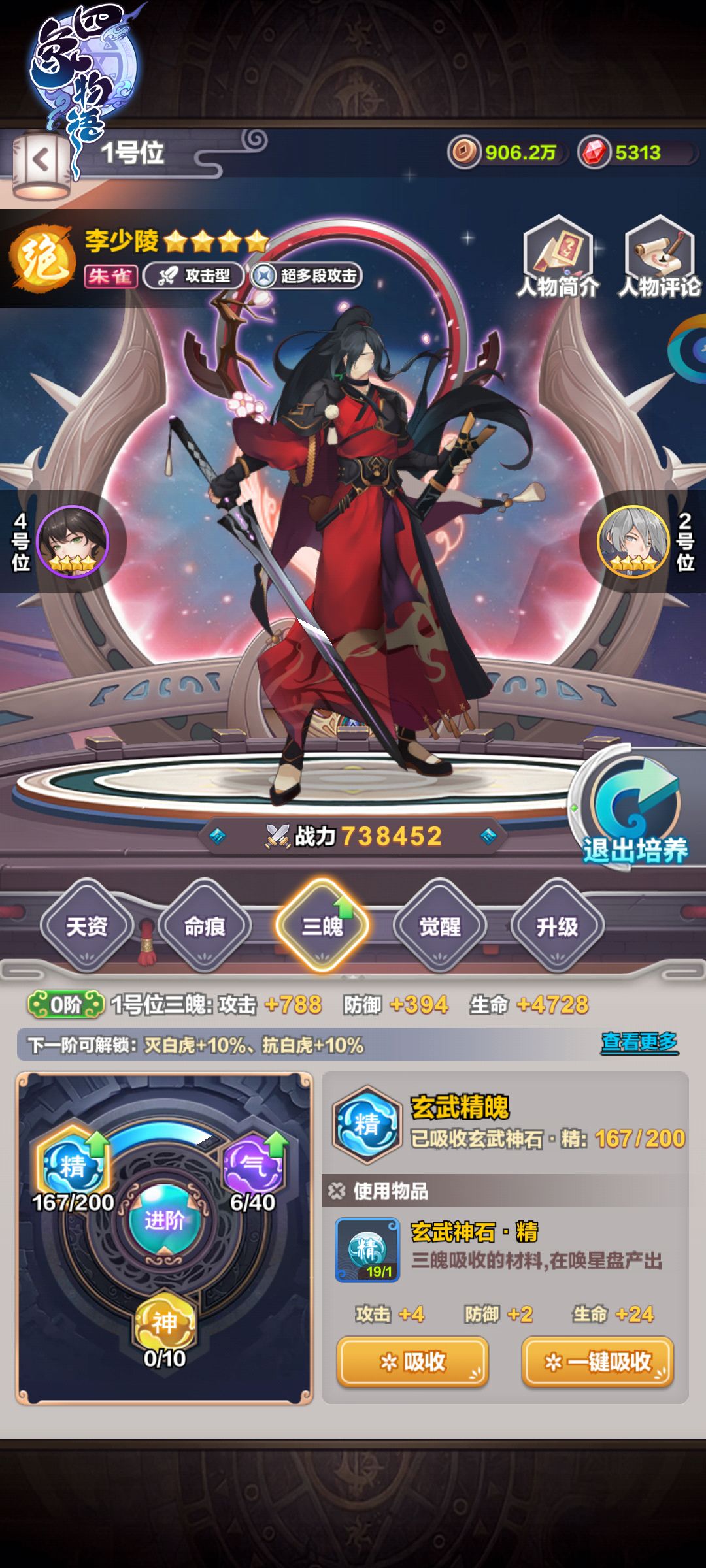 三魄的养成分为[精]、[气]、[神]三魄道具的吸收,和吸收满后消耗【三魄结晶】的升阶。
