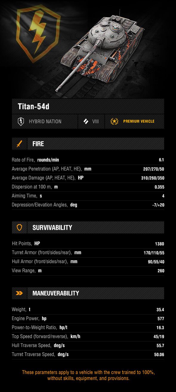 想象一下一辆多功能战车,它具有中型坦克的机动性、轻型坦克的快速炮塔和可与重型坦克相媲美的正面装甲。还有更多!Titan-54d 配备了我们的突破性开发——独特的 动态装甲系统。它会激活炮塔和车体上的额外屏幕,立即将好的装甲变成更好的东西!