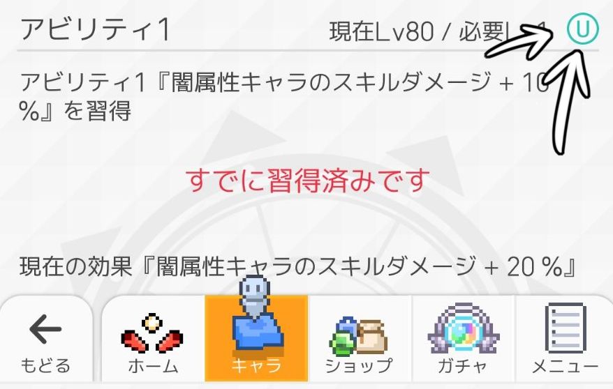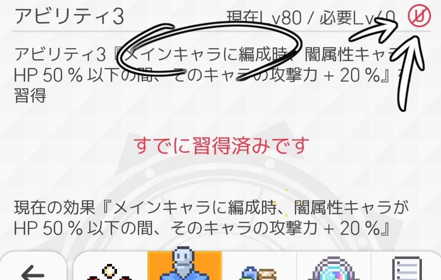 我们可以看到,左侧的图的U字是红色带禁止的样式,并且还有“メインキャラに編成時”这句,很明显的,这个技能只能在Main位生效~