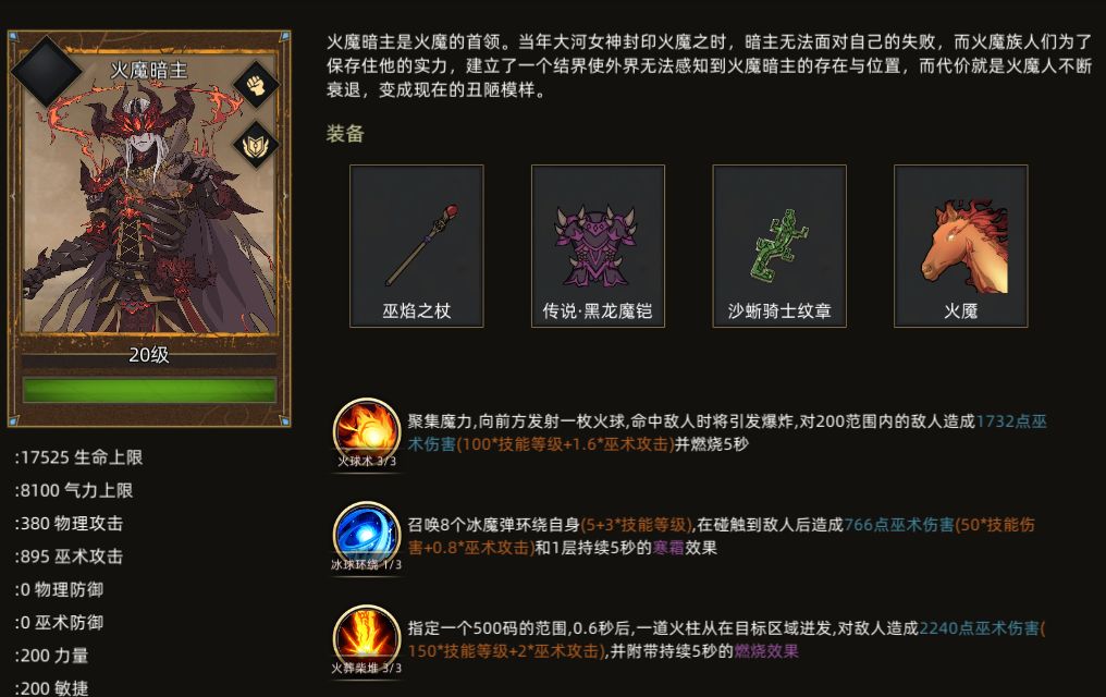 同时,火魔人将领身上还有其他不少好东西,例如龙骨项链,黑龙魔铠等,反正和他们的好感已经很低了,干脆再多刷几遍把他们利用起来咯。