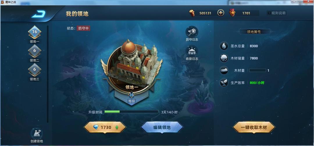 四:领地。领地的作用就是收集神木和防守玩家进攻而获得装备碎片了,有新玩家可能困惑到底是把自己的第一个领地一直升高级呢还是多创建几个领地呢?以我的经验,我建议领地到了6级或7级就创建领地吧,领地高了没人打更不划算,如果查看自己的领地被攻打日志,发现对方攻打太容易,就再把领地升一级,也就是在领地等级和数量之间找一个平衡,既让别人打得过,又能打掉他不少卡牌,达到神木和装备碎片双丰收。