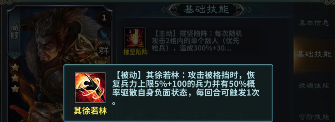 被动技能-其徐若林:攻击被格挡时恢复兵力,有概率驱散自身负面效果,一回合触发一次