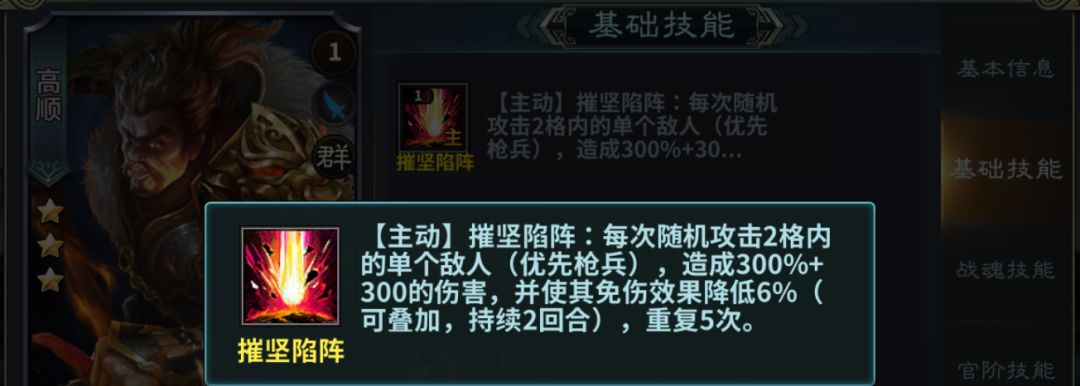 怒气技能-摧坚陷阵:每次攻击2个内的单个敌人,可重复5次,还能使其免伤效果降低,可叠加
