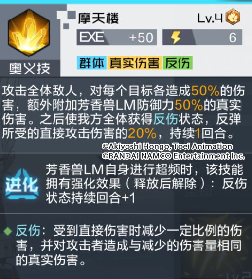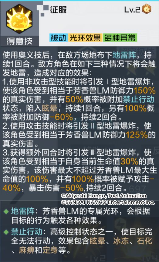 通过技能解析可以看出,芳香兽LM拥有极具特色的技能效果。被动技可提升自身速度,并可以在开场获得额外AP点数。奥义技不仅可以根据自身防御性属性,额外附加一定百分比的真实伤害,同时还能使我方全体获得反伤状态。除此之外,芳香兽LM在使用奥义技后,将触发得意技的特殊陷阱机制,在敌方场地布下地雷阵,敌方在地雷阵中使用技能时,将根据技能类型引爆对应型号的地雷,通常技也有概率直接对目标随机引爆一种地雷的效果。可以说是非常强大的辅助类型数码宝贝,相信芳香兽LM在队长的阵容编队里会有不错的表现!