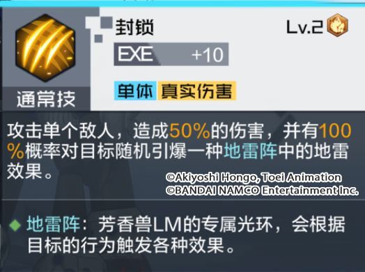 技能解析:可对单体目标造成伤害的通常技,有概率直接对目标随机引爆一种地雷的效果。