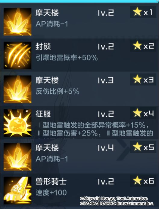 技能解析:伴随奥义技施放的光环效果,在敌方场上布下地雷阵。敌方在“使用非攻击技能”,“发动攻击”,“获得额外行动回合”三种行为下,将分别触发1种类型的地雷爆炸效果。
