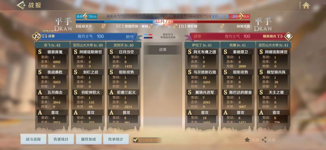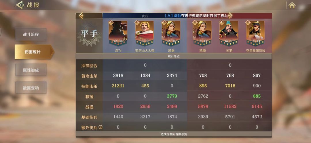钳形攻势,老技能了,使自身力量、智力属性增加10.2→20点,若自身为副将,则使我方主将也获得相同属性提升效果,并使主将每回合有概率提升50%造成的所有伤害。伤害提升给到岳飞,伤害爆炸。