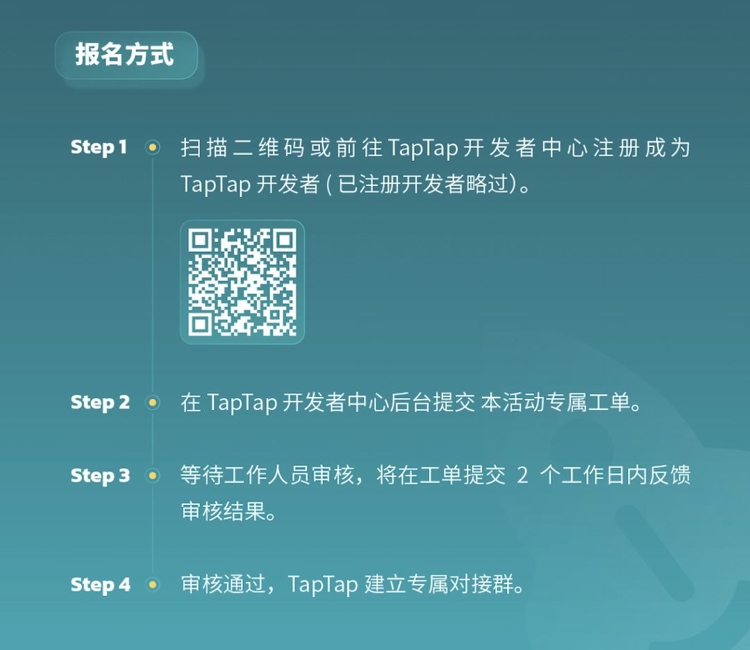 • 通过TapTap报名:扫描下方二维码或点击链接,进入TapTap开发者中心并登录,通过活动专属工单提交报名信息。