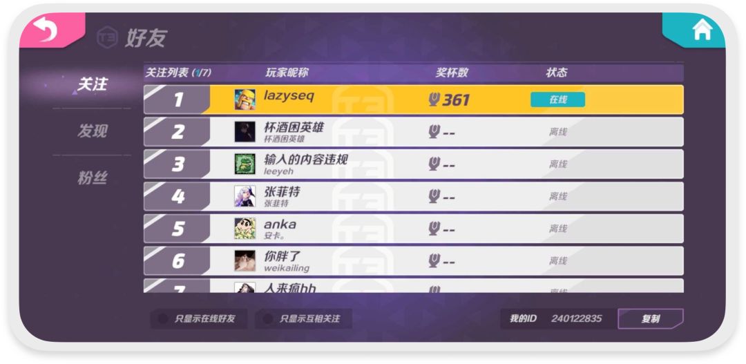 支持根据昵称或好友码搜索好友,TapTap昵称或游戏昵称都可使用,游戏昵称调用 nickname 接口传上传即可;好友码则是由TDS 生成一个 6 位的纯小写字母串码,游戏可按需使用。