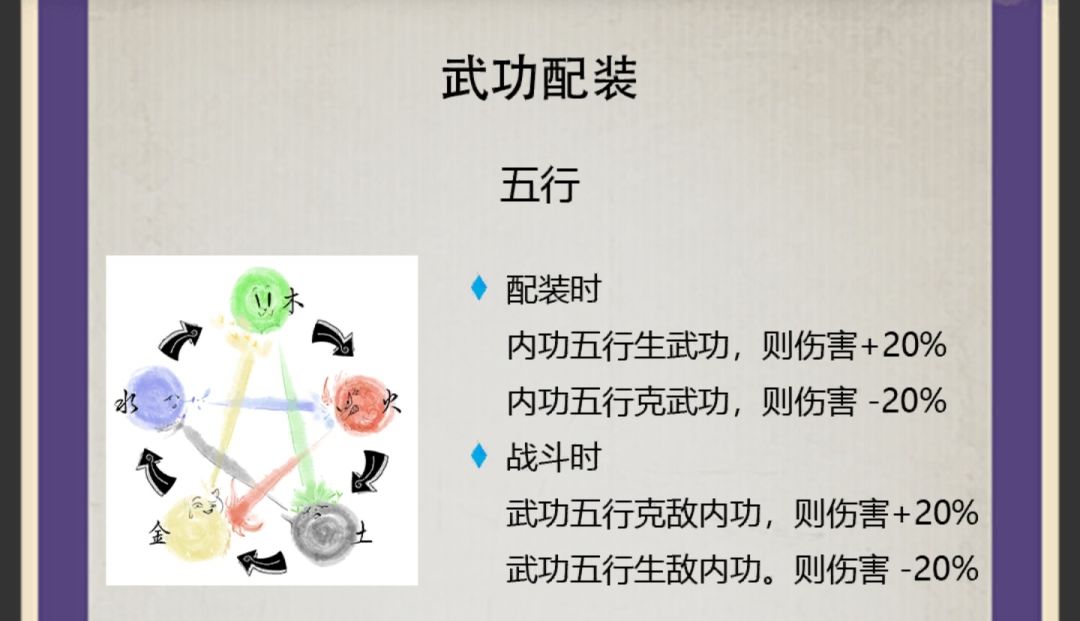 特别要强调的一点是,其中五行的增减,只与自身的内功、自己使用的武学以及对手上一回合使用的武学有关,与对手所装配的内功无关。