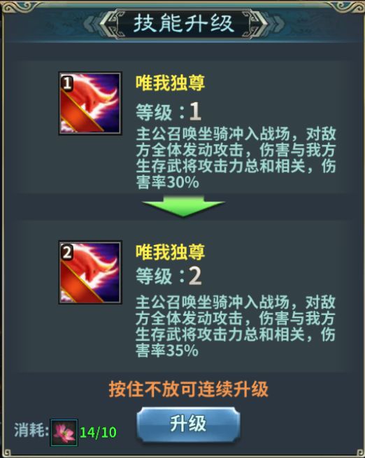 技能可以通过消耗灵花升级,灵花可以通过过关斩将、寻宝商店、元宝商店,购买礼包等等途径获取。升级消耗的灵花:级数*10