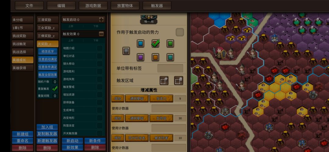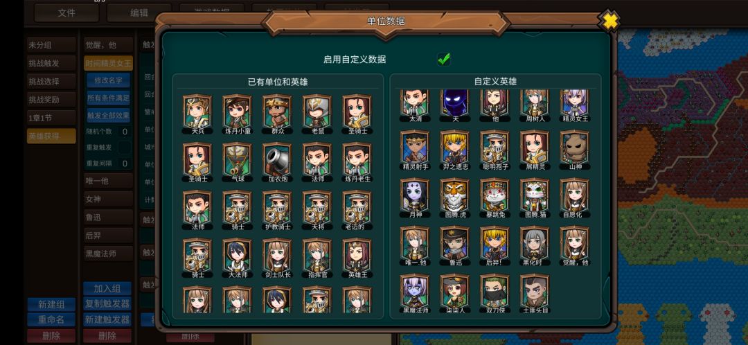 这段时间一直修改数据,看见玩的人少,也没发出来,不过有人催我就发一下。然后现在是删除了很多英雄,然后加了一个唯一他的几个加属性触发器,例如天的击败奖励就是