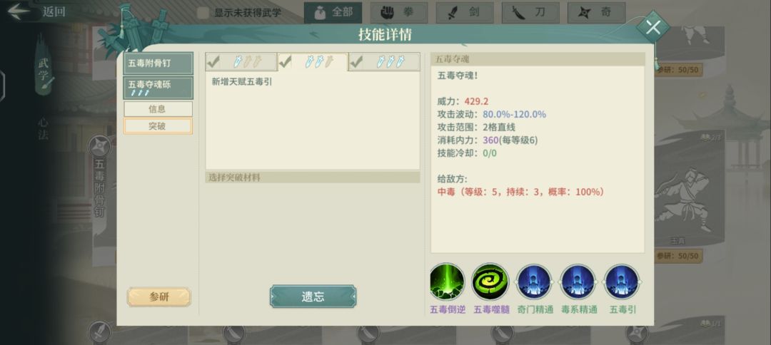 适合玩毒的侠客或门派,天赋需二突解锁。