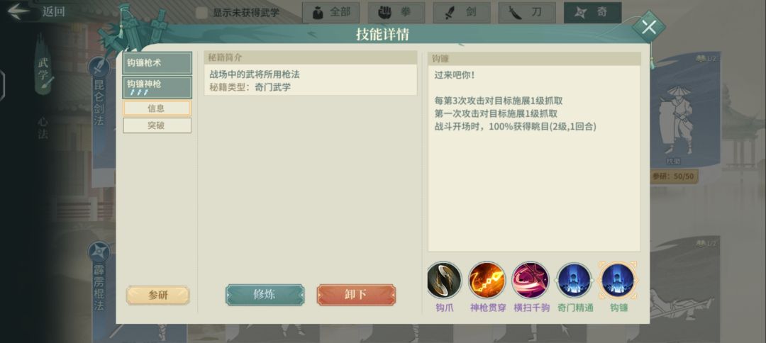 钩镰枪作为辅修武学作用可在开局强行抓取敌方,聚拢敌人以提供己方输出良好的输出环境。