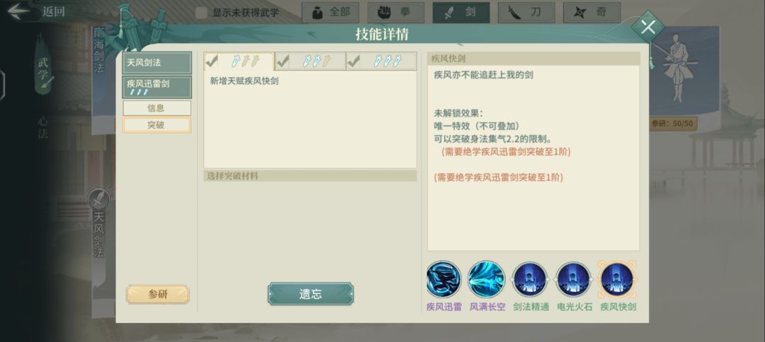 进阶后的疾风剑更是一门顶级辅外,不仅保留了增加连击概率的天赋,在1突后还可以帮助侠客突破2.2集气上限,让你的侠客更快!更强!