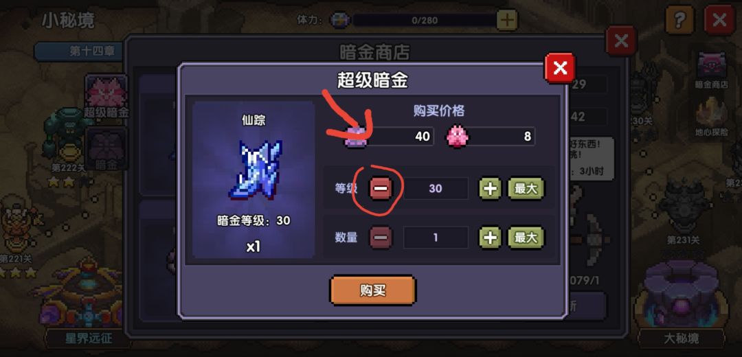 (1)进入小秘境14章前:打造一套7级大符文和30级暗金装备后,体力全部用在樱花岛和星海岛。