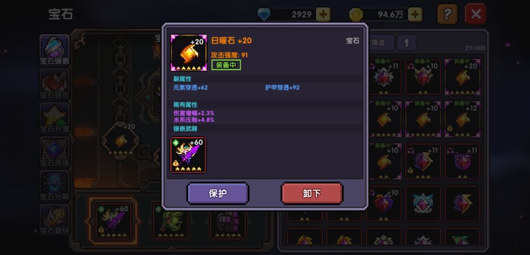 2、中期:装备9颗六星主词条橙色元素穿透的黄宝石(副词条属性压制/伤害增幅/克制增幅三选二),红宝石选九种不同的镶嵌在宝石聚合(强迫症玩家可以先慢慢挑好胚子)均衡升星和强化,