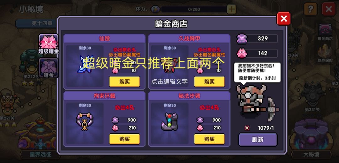 (2)进入小秘境14章后:每周优先暗金房和宝箱房刷满20个电池,然后樱花岛2次星海岛4次(优先兑换魔神石和宝石词条洗练材料),其余体力刷精英房。
