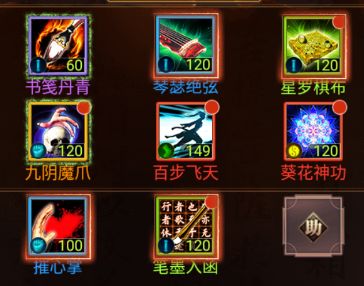 武学搭配:琴棋书画套+九阴套/弹指套+百步+葵花/狮子吼