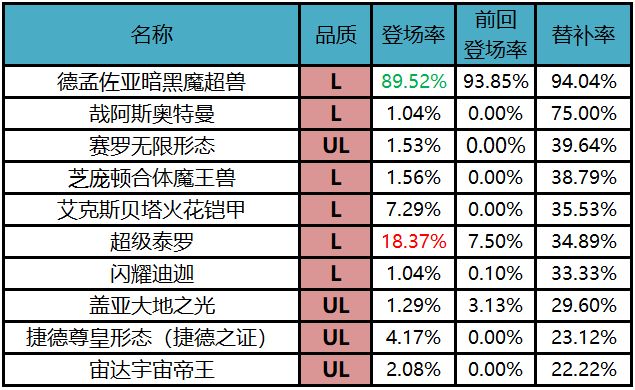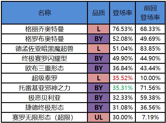 (登场率上升最大的角色用了红色字体表示,登场率下降最大的角色用了绿色字体表示)