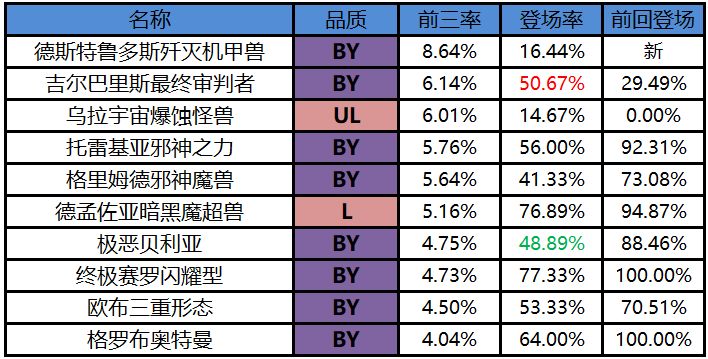 经过以上数据,我们可以发现, 光辉赛罗和格罗布的登场率依旧亮眼,而托雷基亚的使用率开始下降,德斯特鲁多斯作为怪兽阵营新卡,也有不俗的表现。当然,我们后续会继续优化游戏环境,给小伙伴们更好的体验!