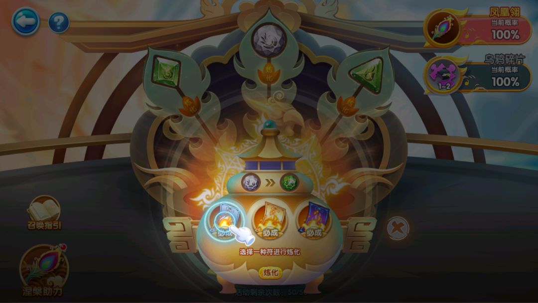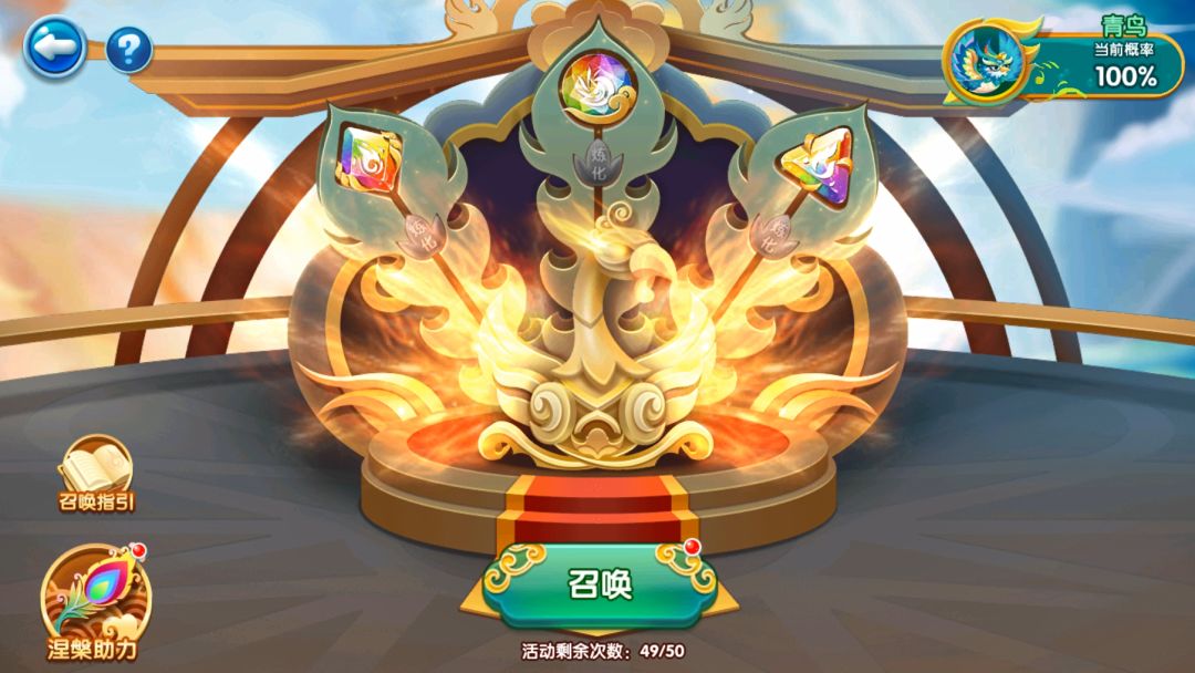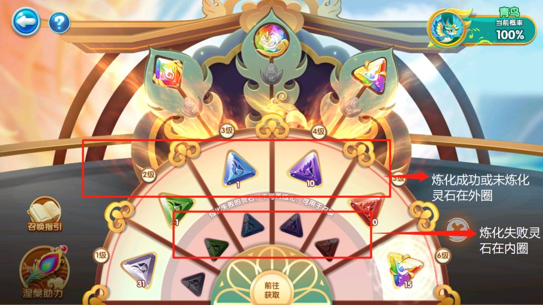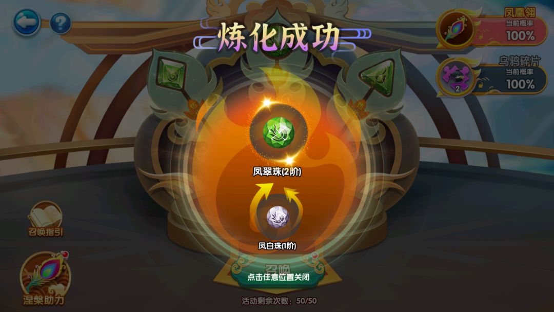 接下来就是激动人心的召唤时刻啦!放入三种不同类型灵石后,右上角界面将出现获得奖励的成功率(据说三种一样等级的凤灵石召唤效果会更好哦)!