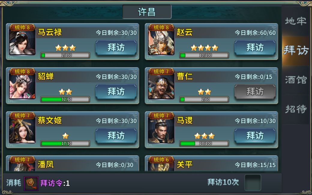 拜访:获得统帅8和10的武将后,部分武将会显示在拜访系统里面,每日可通弄过消耗拜访令获取武将将魂,每日重置拜访次数。