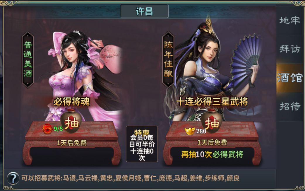 酒馆:消耗元宝或者美酒进行抽取统帅8和统帅10的将魂。具体可以点击左下角的问号进行查看规则。