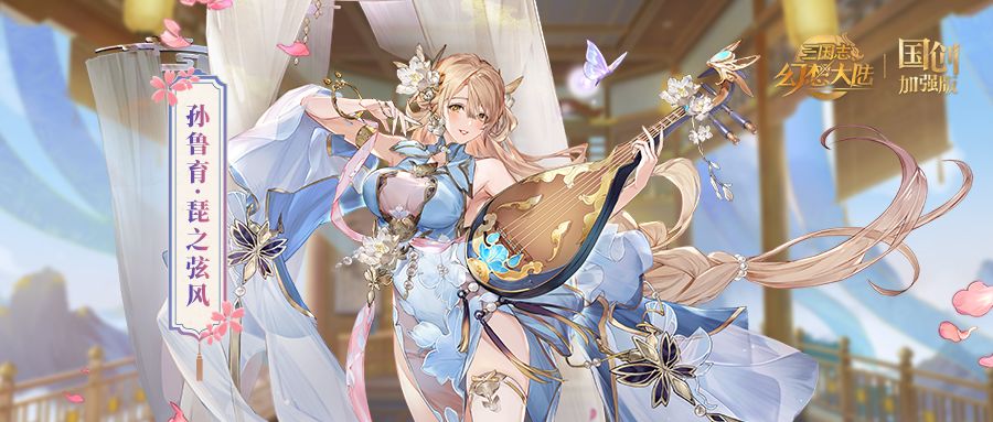 琵琶的声清脆明亮,弹奏快如溪水雀跃,慢如微风徐徐。非常适合江南之地出身的吴国公主孙鲁育所持有。整体服饰点缀蝴蝶和缠花元素,体现孙鲁育心思细腻与温柔善良的一面。帐下帷幔随风起,轻盈的身姿拨动琵琶琴弦带给人亲切之感。闻着青草的味道,孙鲁育从纱后缓缓露出清雅弦音使人流连驻足。